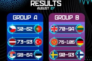 体育资讯8月28日讯 男篮欧锦赛首日六场比赛结束,全部赛果如下:
