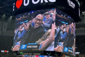 前NBA球员费舍尔来到现场观战,俄克拉荷马球馆内掌声雷动。