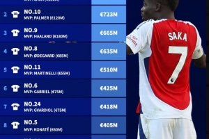 体育资讯9月9日讯 英超各队中,7号是一个非常重要的号码,身披7号球衣的球员通常是球队的核心。根据德国转会市场的统计,英超球员身披7号球衣的球员总身价达7.71亿欧元,其中萨卡1.5亿欧元最高。