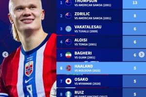 近25年世预赛单场射手榜:最高纪录13球,哈兰德5球并列第6
