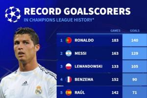 体育资讯09月16日讯 今夜,新赛季欧冠就将打响。德转在赛前列出了欧冠历史射手榜,C罗以140球位列榜首,梅西129位列第二,莱万105球第三。