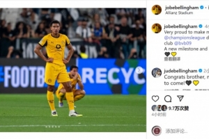 此役乔布-贝林厄姆替补出场,上演欧冠首秀,他在社交媒体上晒出比赛照片,并写道:“很自豪在多特上演欧冠首秀,一个新的里程碑,也是学习更多的开始。”
