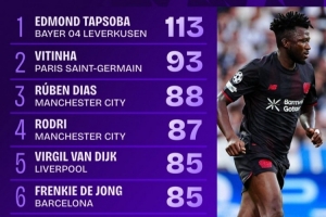 塔普索巴完成113次传球,是本轮欧冠唯一传球次数100+的球员