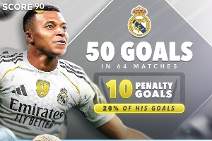 姆巴佩(皇马):64场50球,10点球,占比20%