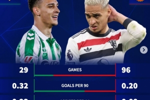 体育资讯9月25日讯 在欧联杯贝蒂斯2-2战平诺丁汉森林的比赛中,安东尼传射建功。德转也对比了安东尼在效力曼联以及贝蒂斯期间各项赛事数据情况,具体如下: