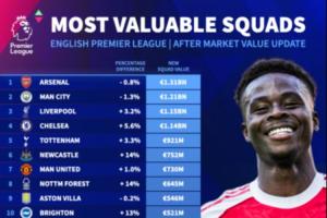 英超俱乐部身价排名:阿森纳、曼城、利物浦前三,曼联遭纽卡超越