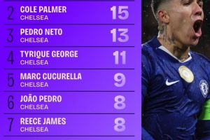 切尔西2025年各项赛事参与进球榜:恩佐20球居首,帕尔默次席