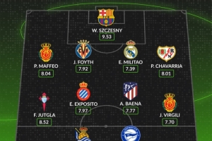 后卫:马菲奥(马洛卡,8.04分)、福伊特(比利亚雷亚尔,7.92分)、米利唐(皇家马德里,7.39分)、佩普-查瓦利亚(巴列卡诺,8.01分)