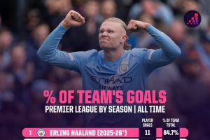 依赖!哈兰德本赛季联赛进球占比全队64.7%,英超历史最高