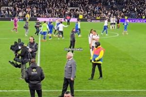 弗兰克赛后进场与斯彭斯与范德芬交流,两人直接走过并未停下脚步,斯彭斯还摊手抱怨,弗兰克一脸懵地回头看了看他们。