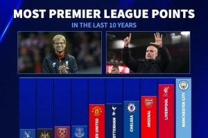体育资讯11月9日讯 德国转会市场统并列出近10年英超球队总积分排名,曼城847分居首,利物浦、阿森纳二三位。