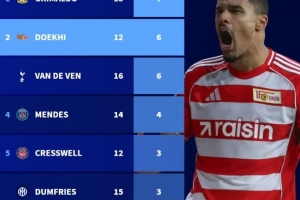本赛季五大联赛后卫进球榜:格里马尔多7球居首,范德芬6球次之