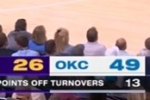 截至发稿,雷霆领先湖人23分,其中利用失误得分高达13分,而湖人则挂零。