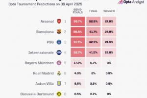 体育资讯04月10日讯 欧冠1/4决赛首回合全部结束,OPTA更新了各队晋级概率。