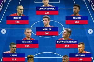 体育资讯4月27日讯 在本轮德甲拜仁3-0击败美因茨,穆勒达成第500次德甲出场里程碑。德转也盘点了穆勒德甲生涯搭档次数最多的队友阵容,以下为具体情况: