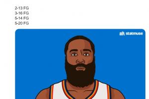 本场比赛,杰伦威16投3中,美媒Statmuse晒出了他本轮的拉胯数据:13中2、16中3、14中5、20中5,但配图应该是错了,配的是哈登。