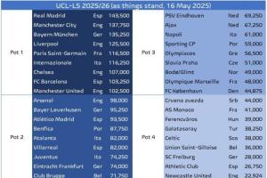 体育资讯05月16日讯 今日足球数据媒体Football Meets Data更新了截止至今日,下赛季欧冠的分档情况。