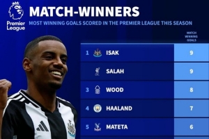 体育资讯5月16日讯 德国转会市场统计了本赛季英超打进制胜球最多的球员,伊萨克和萨拉赫并列第一。