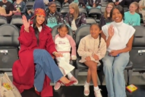科比遗孀瓦妮莎携3个女儿来到前排观战,面对摄像头4人开心地打着招呼。