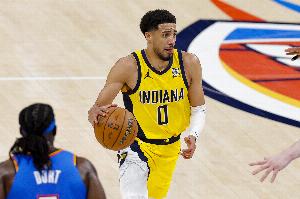 上半场哈利伯顿8投5中砍下12分篮板7助攻,仅2失误。