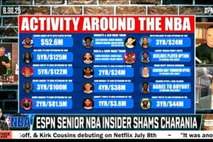 体育资讯07月01日讯 名记Shams在播客节目《PatMcfeeShow》的直播中连续说了两遍:“(当地时间)今晚会有大交易,今晚会有大交易(There's gonna be some BIG deals tonight)!”