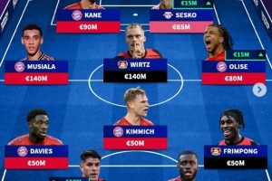 中场:穆西亚拉(拜仁,1.4亿欧元)、维尔茨(勒沃库森,1.4亿欧元)、基米希(拜仁,5000万欧元)、奥利塞(拜仁,8000万欧元)